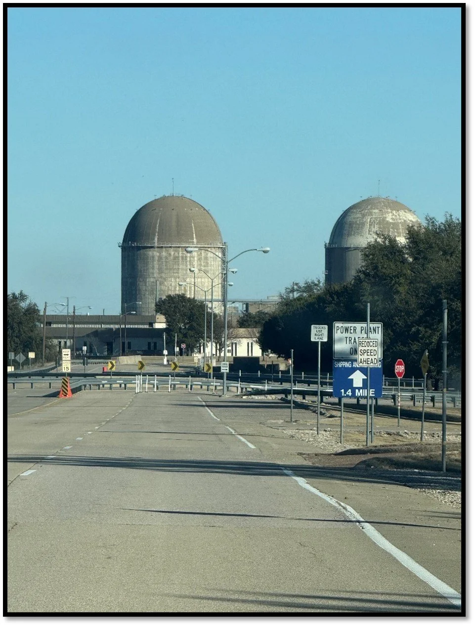 Front entrance with the containment domes of Comanche Peak 1 and 2 looming in the background. Each is 265ft tall with 4.6ft thick reinforced concrete walls lined on their interior faces with continuously welded steel plate up to 1/2 inch thick. Combined, this is thick and dense enough to prevent any ionizing radiation from escaping the reactor cores and to shield the reactors from any outside hazards like severe weather. Location shown on map.