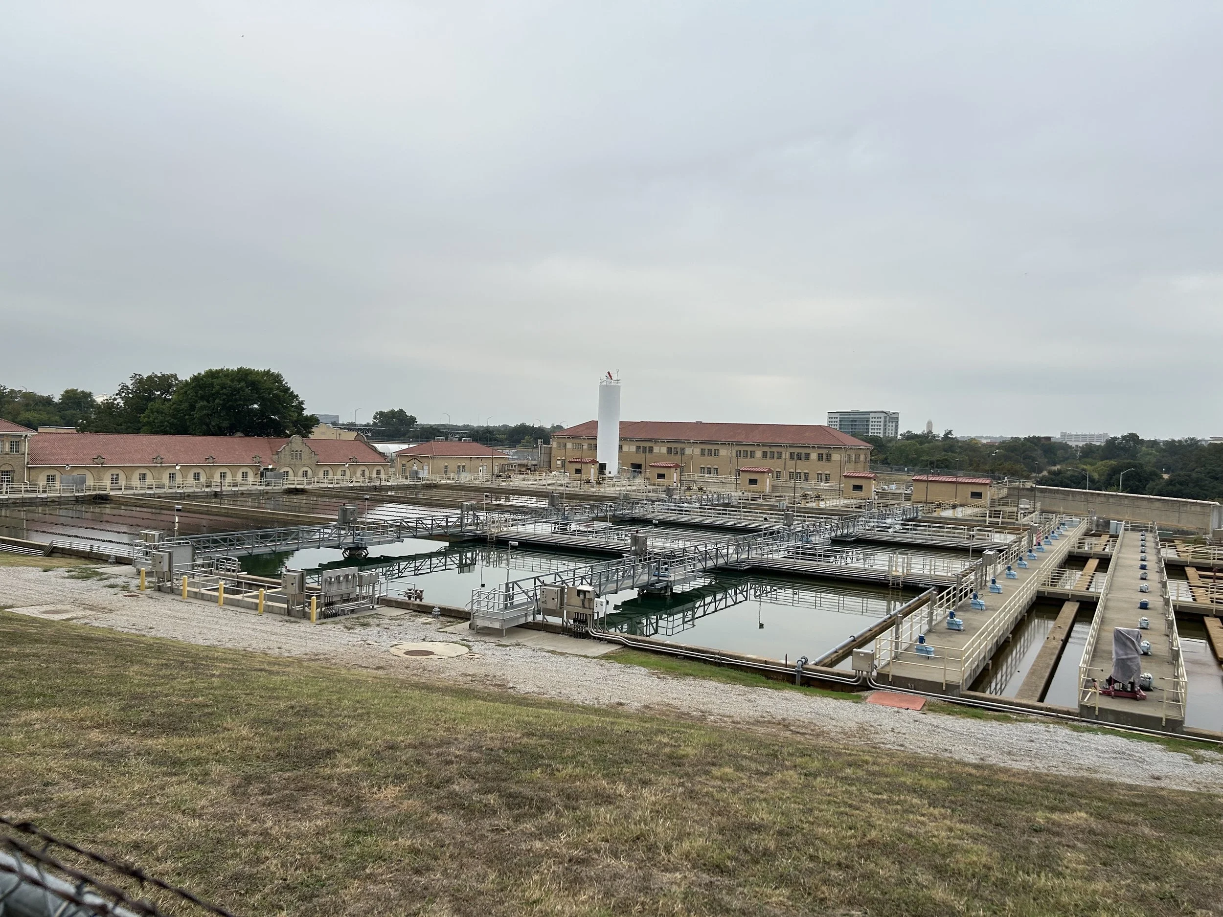 North Holly Water Treatment Plant’s sedimentation basins with some of the original pump house structures in the background as viewed from the corner of W Tenth St. and Fournier St.